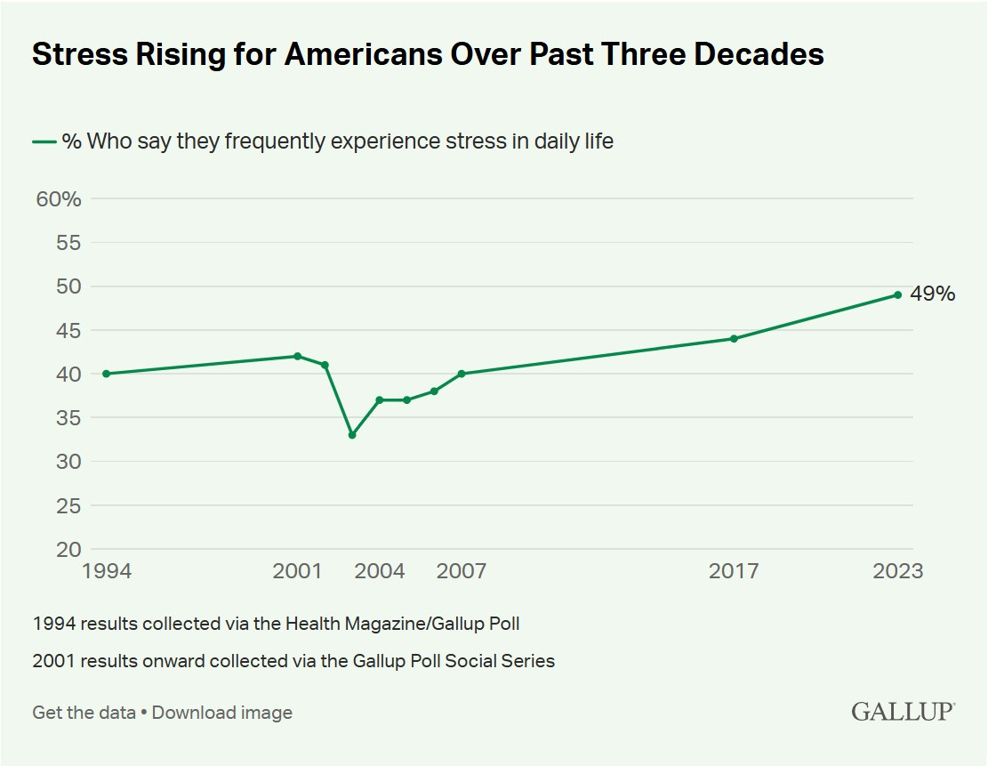 Frequent stress levels in the U.S. are at an all-time high (49%), rising 16 points over the last two decades. This upward trajectory in stress directly mirrors the downward trend in sleep hours.